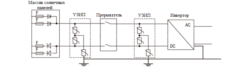 Данные устройства устанавливаются в сетях постоянного тока параллельно проводу от солнечных батарей до инвертора напряжения. Для работы УЗИП обязательно наличие заземляющего контура. УЗИП необходимо устанавливать в двух точках, если длина проводов от панелей до инвертора/контроллера составляет более 10 метров: один в непосредственной близости от солнечных панелей, второй - в распределительном щитке перед инвертором (см. схему нижу).