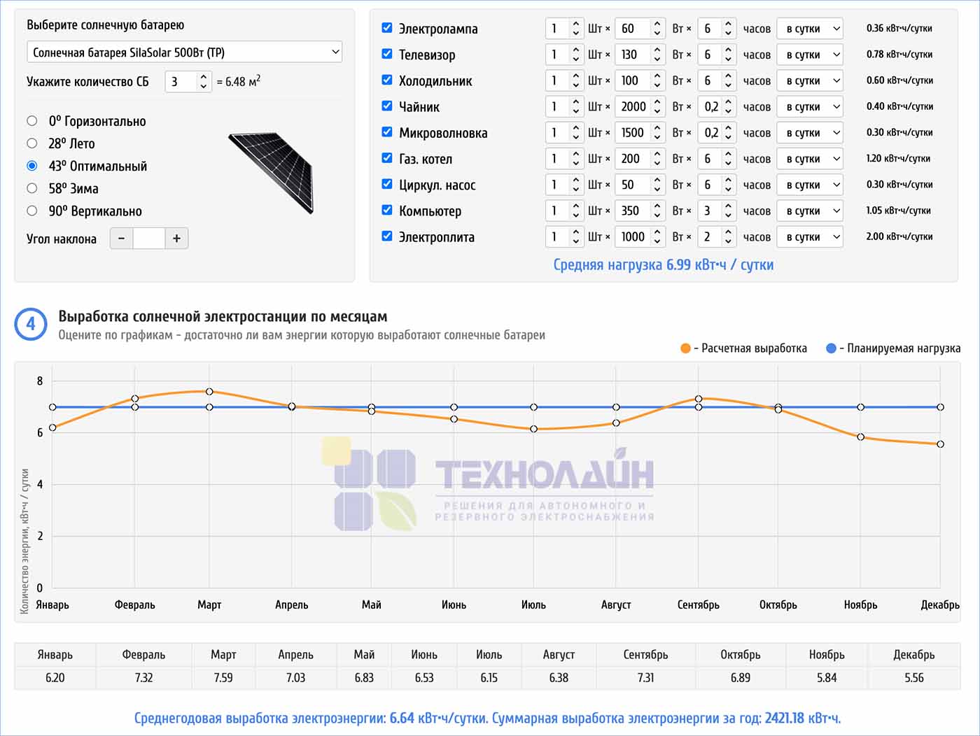 Примечание: Все расчеты являются примерными, для правильного и сбалансированного подбора систем автономного электроснабжения под Ваши нужды, необходимо обратиться к менеджерам нашей компании или заполнить и отправить заявку на расчет солнечной электростанции.